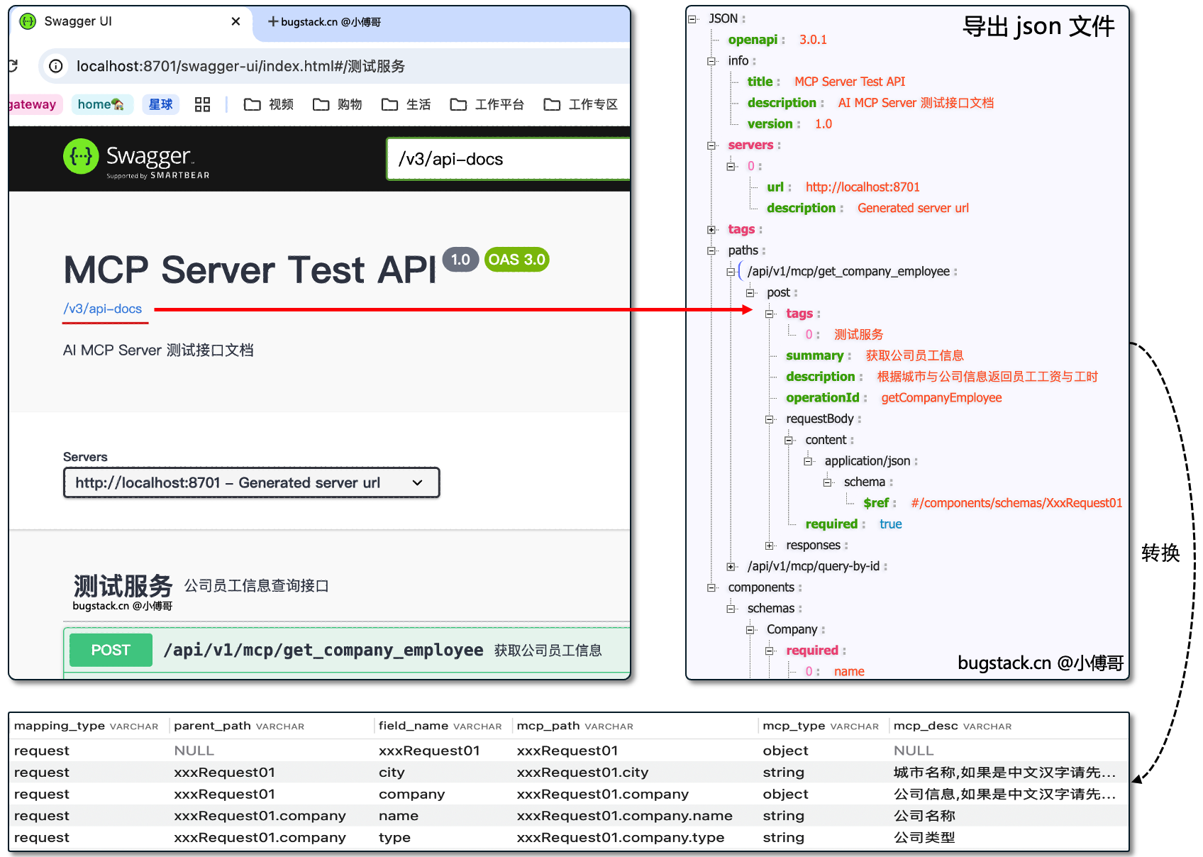 如图,我们需要的就是这份标准的 OpenAPI 接口的 JSON 文件,使用它解析并转换为目前 ai mcp gateway 库表结构中设计的 http 协议和字段映射关系。你可以把这部分的解析,当做一个工具包使用。