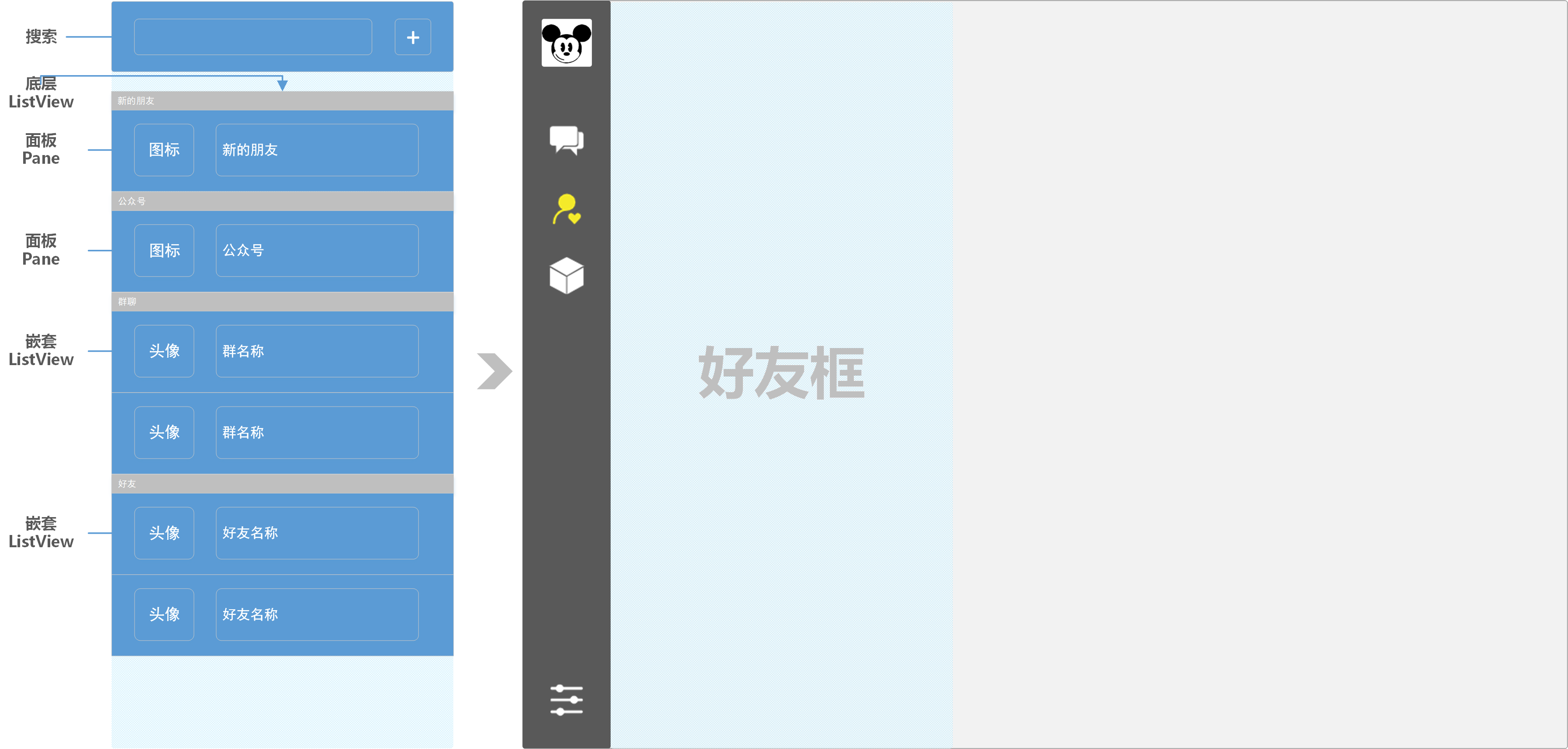 • 经过我们的分析,在使用 JavaFx 组件开发为基础下,这部分是一种嵌套 ListView,也就是最底层的面板是一个 ListView,好友和群组有各是一个 ListView,这样处理后我们会很方便的进行数据填充。