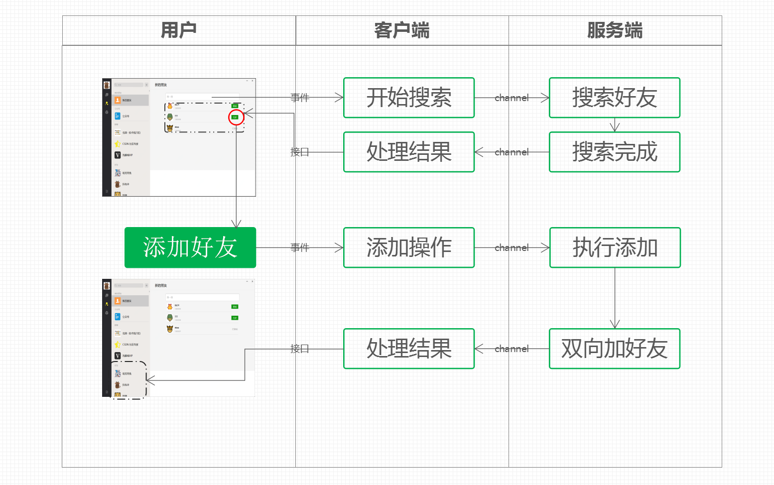 - 从上面的流程中可以看到,这里包含了两部分内容;(1) 搜索好友,(2) 添加好友。当天就完成好友后,好友会出现到我们的好友栏中。