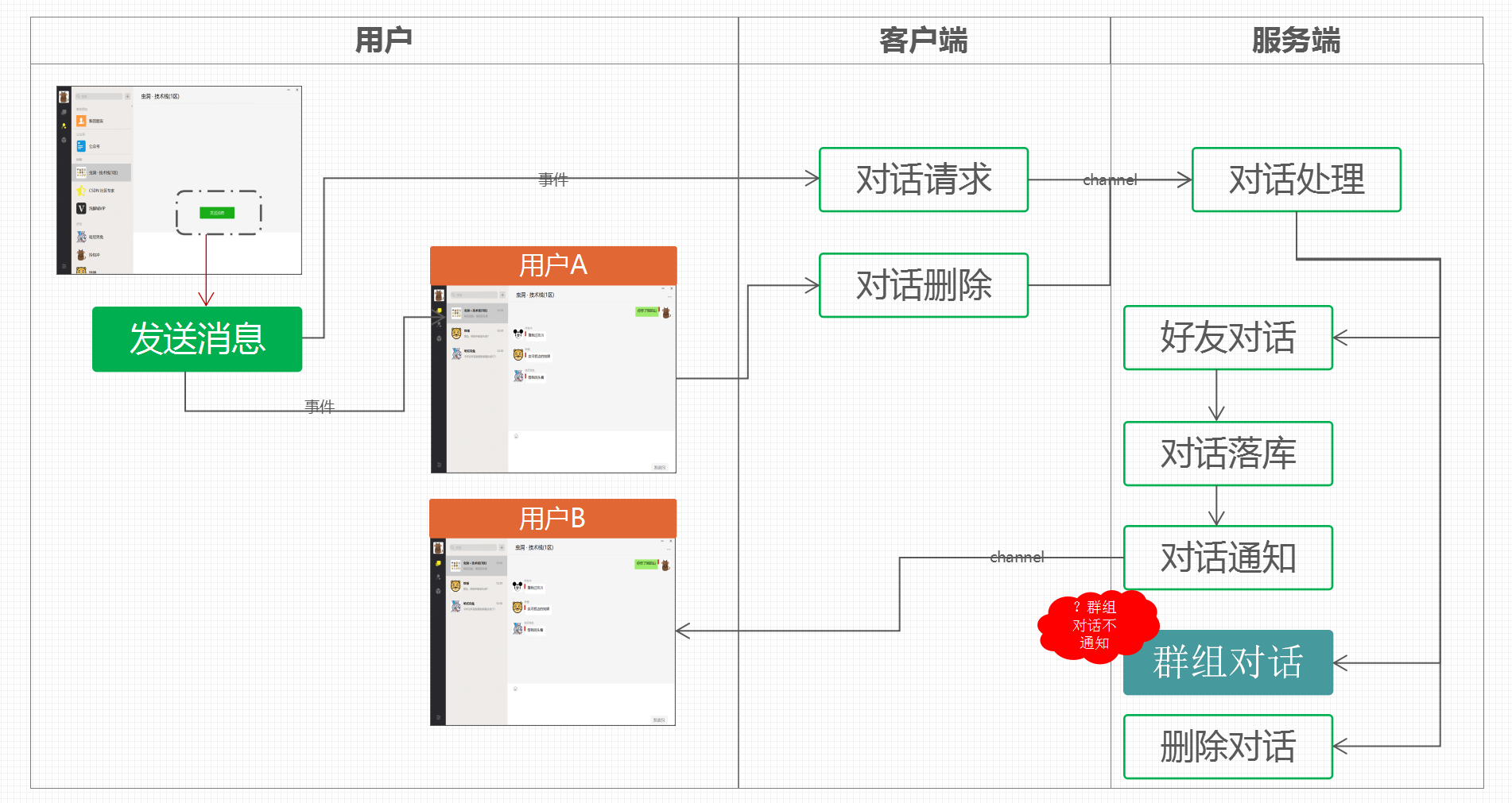 - 从整体的流程可以看到,在用户发起好友、群组通信的时候,会触发一个事件行为,接下来客户端向服务端发送与好友的对话请求。