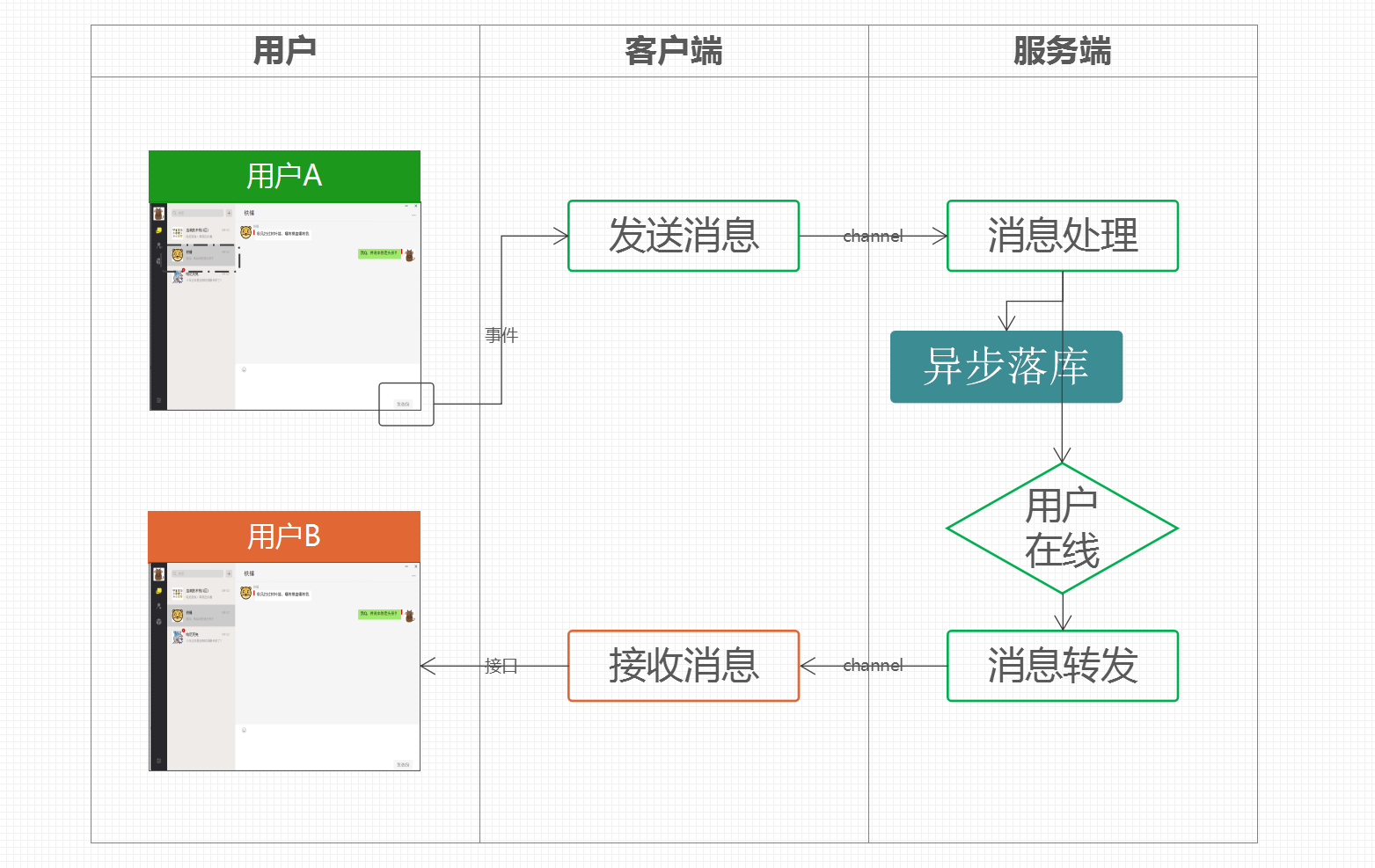 - 最后获取到好友的 Channel 后,将消息发送给好友。好友收到消息后,通过 UI 的接口,使消息展示到界面上。