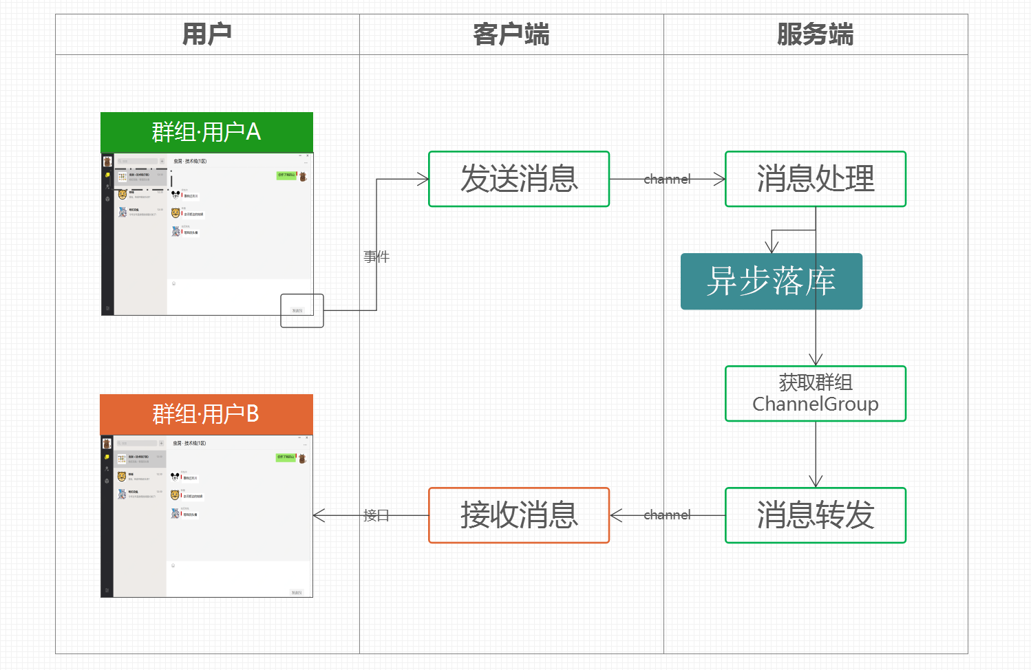 • 当然这里同样需要将群组的消息进行异步落库,保存群组的聊天记录。聊天记录这些信息在我们设计开发用户登录后,都会进行从数据库初始化展示到聊天面板中。
