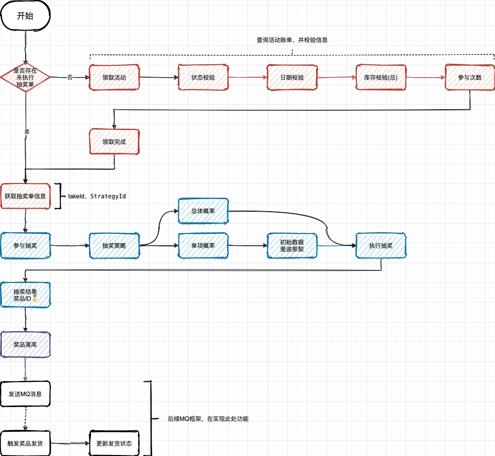 - 抽奖整个活动过程的流程编排,主要包括:对活动的领取、对抽奖的操作、对中奖结果的存放,以及如何处理发奖,对于发奖流程我们设计为MQ触发,后续再补全这部分内容。