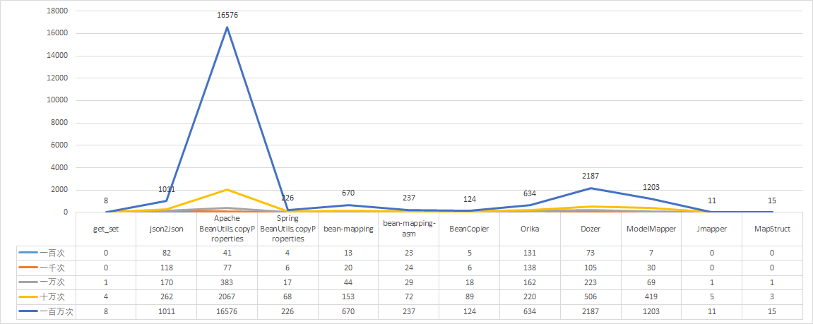 目前我整理出,用于对象属性转换有12种,包括:普通的getset、json2Json、Apache属性拷贝、Spring属性拷贝、bean-mapping、bean-mapping-asm、BeanCopier、Orika、Dozer、ModelMapper、JMapper、MapStruct 接下来我们分别测试这11种属性转换操作分别在一百次、一千次、一万次、十万次、一百万次时候的性能时间对比。