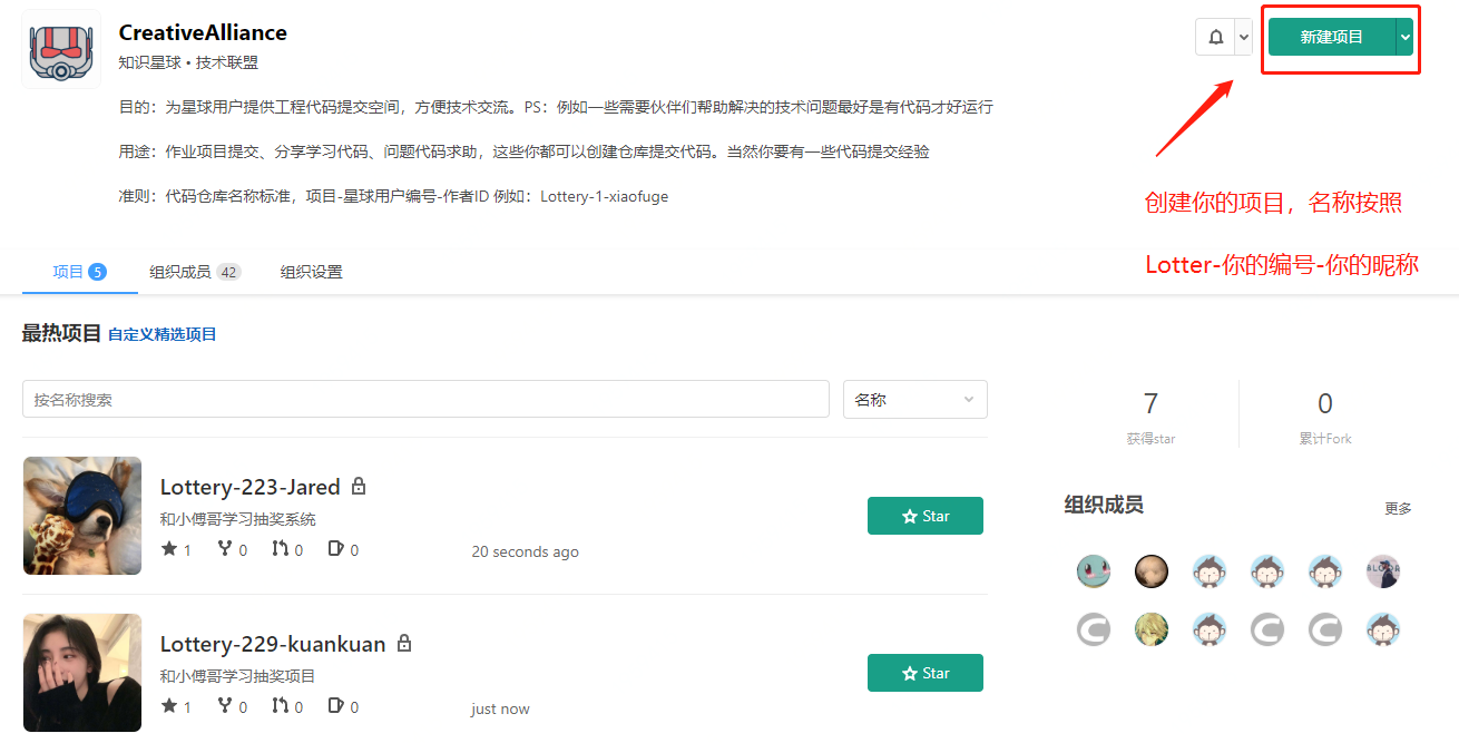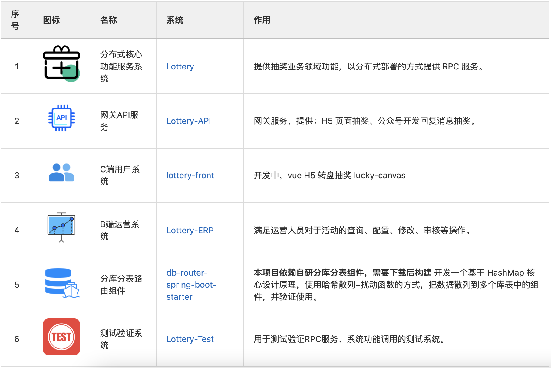 • 使用说明:为星球用户提供工程代码提交空间,你可以把抽奖系统的学习代码提交到空间中,按照代码仓库名称标准,项目-星球用户编号-作者ID 例如:Lottery-1-xiaofuge