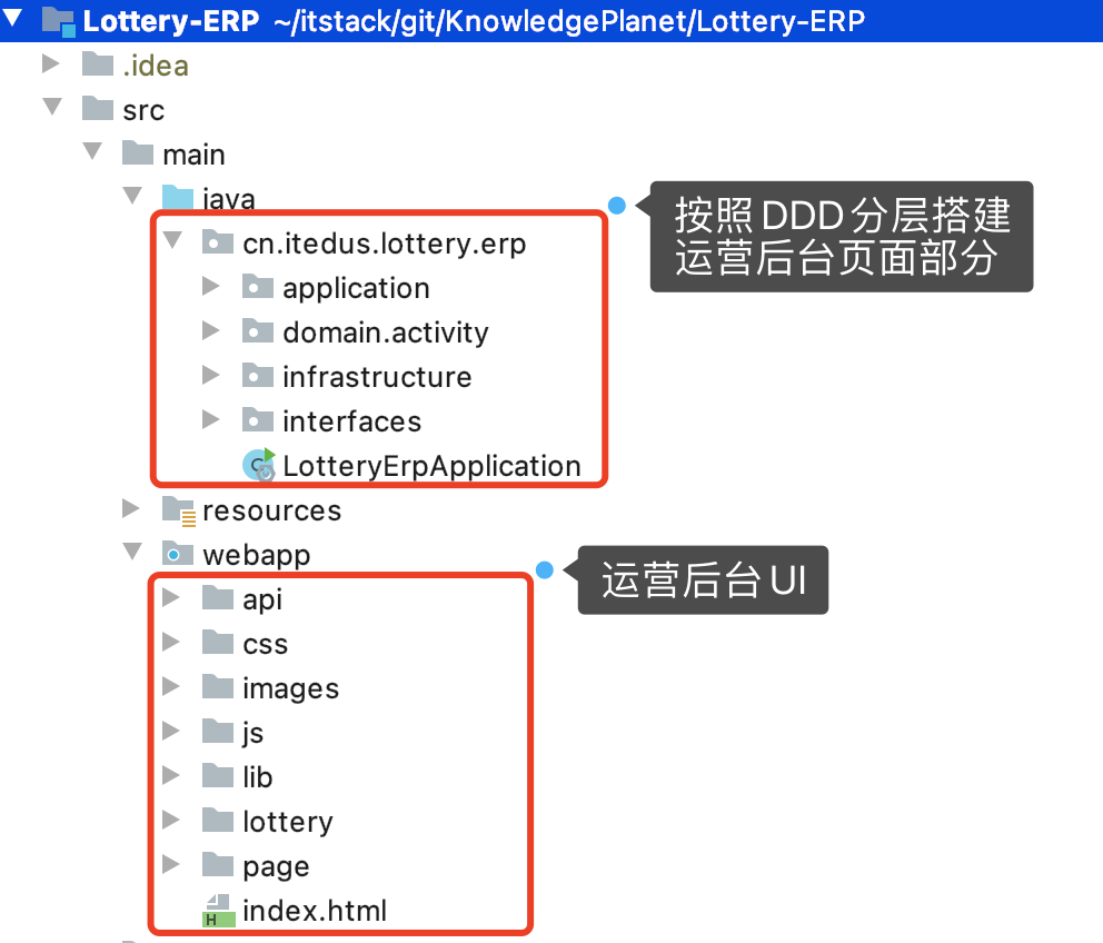 - 之所以搭建 DDD 结构是因为这里是 DDD 在没有 RPC 引入的时候,更为紧凑的结构模型,可以在这里体现给大家。它的整个结构你可以看到 Application 应用层定义接口在 Domain 领域层做实现,最终交给 interfaces 接口层使用。