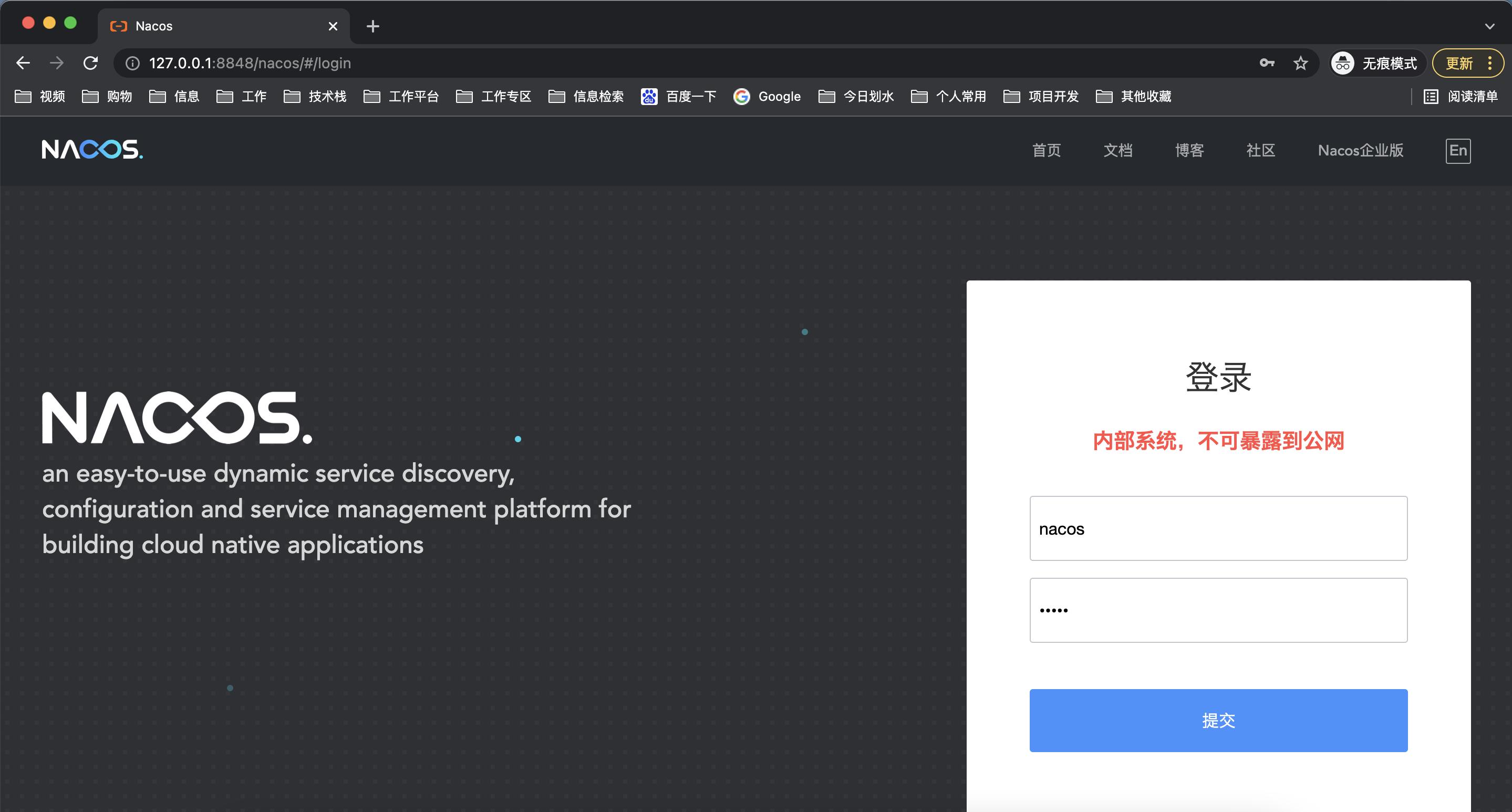 docker run -d -p 8848:8848 --env MODE=standalone --name nacos nacos/nacos-server - 打开链接:http://127.0.0.1:8848/nacos/ (opens new window) -
